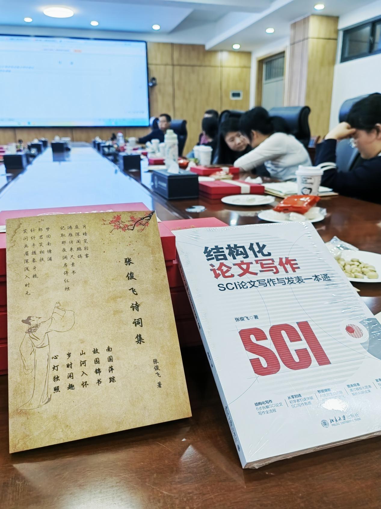 随后,张俊飞老师进行了科技与人文主题的双重分享。他首先介绍了《智能简史》一书,从大脑演化到人工智能的发展梳理技术演进脉络;随后结合本人著作《结构化论文写作——SCI论文写作与发表一本通》与《张俊飞诗词集》,分别探讨了科研写作的方法与工科教师的人文情怀。