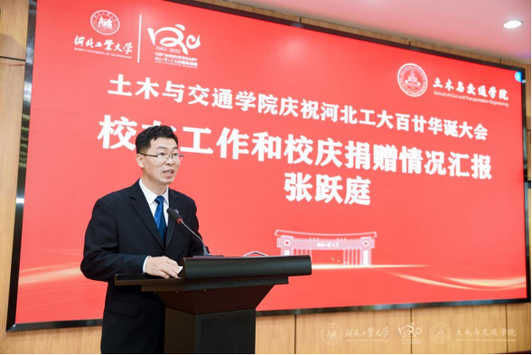 正处级辅导员张跃庭同志作校友工作和校庆捐赠情况汇报,感谢校友对学院、学校发展的大力支持。土木与交通学院的校友积极支持学院建设和母校120周年校庆,在学校宿舍修缮与校志出版、制作校庆纪念品给予了大力捐赠,并向学院捐款或捐赠土木与交通学院教育基金,提升学院楼文化环境。一批社会企业大力支持学院教育事业和人才培养,捐设创新类奖学金,有力促进了学院工作。
