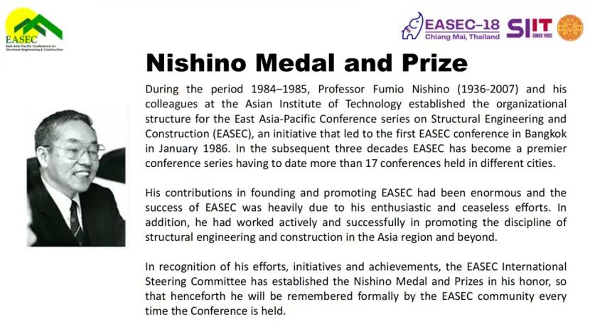 2024年11月13日至15日,第十八届东亚-太平洋地区结构工程与建造国际会议(The Eighteenth East Asia-Pacific Conference on Structure Engineering and Construction ,简称EASEC-18)在泰国清迈举行。我校马国伟教授荣获Nishino Medal,大会主席Prof. C. M. Wang为马国伟教授颁发了奖章。1984年-1985年,Fumio Nishino(1936-2007)教授和他在亚洲理工学院的同事们建立了东亚-太平洋地区结构工程与建造系列会议(EASEC)的组织机构,并于1986年1月在曼谷举行了第一届EASEC会议,此后EASEC会议每两年一届,迄今已在不同城市举办了18届,EASEC会议已成为东亚-太平洋地区乃至全球在结构工程与建造领域最具影响力的学术会议之一,为推动国际间学术交流与合作做出了卓越贡献。为了表彰和纪念Nishino 教授的杰出成就和贡献,2008年EASEC国际指导委员会设立了Nishino Medal和Nishino Prize,并在以后的历届会议上由专家提名有效候选人,经委员会选举产生1位Nishino Medal获得者和2-3位Nishino Prize获得者(其中Nishino Prize候选人年龄要求45岁以下),马国伟教授因其在混凝土3D打印领域的突出贡献,荣获2024年Nishino Medal。Nishino Medal获奖者均为该领域资深专家,历届获奖者包括:亚洲理工学院(AIT)原校长Professor Worsak Kanok-Nukulchai(2008),韩国土木工程师协会(KSCE)原主席Professor Sung-Pil Chang,日本工程院院士Professor Yozo Fujino,中国工程院院士Professor Yeong-Bin Yang,澳大利亚技术与工程院院士Professor Sritawat Kitipornchai、Professor Chien Ming Wang和Professor Hong Hao。